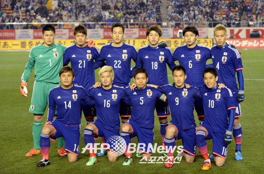 | ◇지난 6일 뉴질랜드와의 평가전에 나선 일본 대표팀 선수단이 포즈를 취하고 있다. ⓒAFPBBNews = News1 |