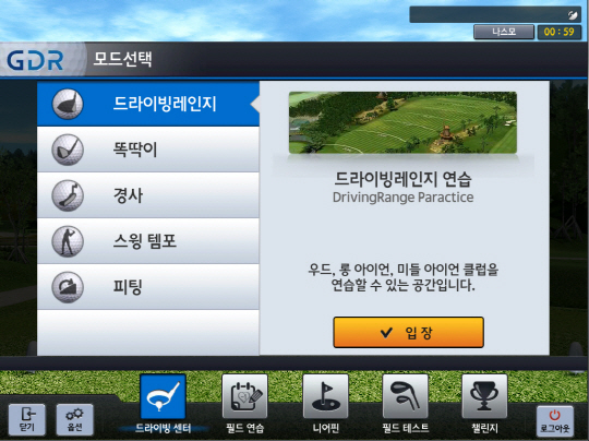 GDR은 '드라이빙 센터' '필드연습' '실력테스트' '챌린지'로 나뉘어져 있다. 드라이빙 센터는 클럽 연습을 통해 비거리, 방향성 등 다양한 분석 테이터를 제공하는 기본 연습 모드다. 초보들을 위한 '똑딱이 모드'도 가능하다. 필드연습에서는 6개의 골프 코스가 정기적으로 교체돼 다양한 코스에서 실전 연습을 할 수 있다. 티샷, 세컨샷, 어프로치샷, 퍼팅 등 4개 영역으로 세분화된 실력테스트와 모드별 주어진 미션을 성공시켜 점수를 획득하는 챌린지 모드가 있어 재미도 더했다. GDR은 연습 데이터를 홈페이지와 모바일 앱으로 전송하는 서비스도 제공한다.