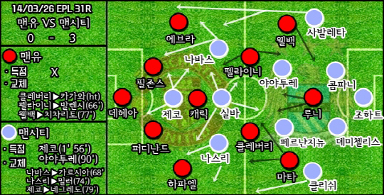 발렌시아와 치차리토까지 가세했다. 하지만 경기 내내 그랬듯 맨유는 공격진의 간격이 너무 넓었고, 개인이 볼을 갖고 내달리는 거리나 시간이 상대에 비해 지나치게 길었다. 맨시티는 피치 곳곳에서 조금 더 부지런한 모습을 보였고, 특정 지역에서 순간적인 수적 싸움에서 늘 우세했다. 맨유의 드리블이 맨시티 수비 2-3명에 둘러싸이는 장면이 많았던 것도 이런 맥락에서다. 루니가 아예 중앙으로 내려가 공격의 실마리를 풀어냈으나, 캐릭의 수비 범위는 이미 눈에 띄게 줄었다. 플랫 4가 전진해 허리를 메우지도 못한 상황, 야야 투레의 슈팅은 세 번째 실점으로 이어졌다. <홍의택 객원기자, 제대로 축구(http://blog.naver.com/russ1010)>