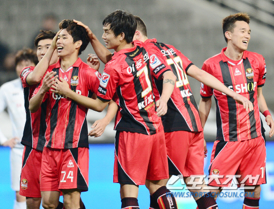 FC 서울과 제주 유나이티드의 2014 프로축구 경기가 26일 서울 상암월드컵경기장에서 열렸다. 서울 윤일록이 팀의 두 번째 골을 성공시킨 후 동료들과 함께 환호하고 있다. 상암=정재근기자 cjg@sportschosun.com/2014.03.26/
