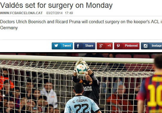 바르셀로나 수문장 발데스 십자인대 파열, 시즌 아웃