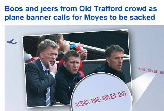 퍼거슨 후임 모예스 맨유 감독의 올시즌 부진에 대해 극도의 불만을 품은 팬들이 예고한 대로, 800파운드(약 140만원)의 비용을 들여 경비행기를 띄웠다. 올드트래포드 상공을 나는 비행기 꼬리에는 '안맞는 자-모예스 나가!(Wrong One-Moyes Out)'라는 원색적인 안티-배너를 매달았다. 올드트래포드 관중석, 모예스를 지지하는 대형 걸개 '선택된 자(The Chosen One)'라는 문구를 정면으로 반작했다.