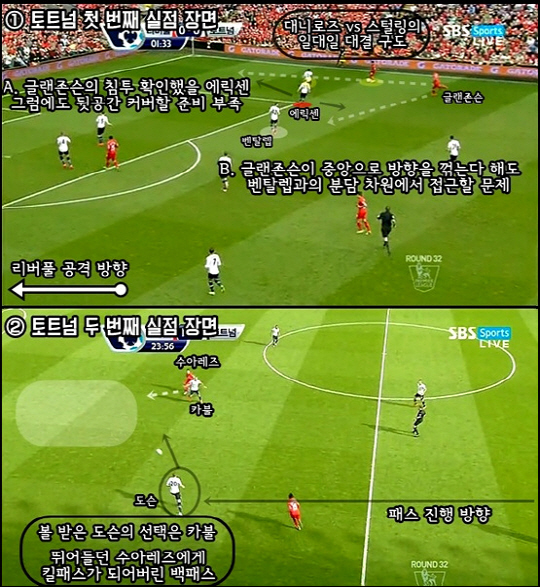 전반 24분, 이번엔 베르통헌 대신 나선 도슨이 일을 냈다. 도슨의 백패스는 수아레즈의 주력과 결정력을 시험했고, 득점 선두의 위엄만 절감했다. 교체 투입 직후 흐름에 녹아들기 어려웠을 것이고, 첫 번째 터치 역시 불안할 만도 했다(서브진은 경기 중 볼 없이 웜업을 하고, 중계 화면만으로 판단하긴 어렵지만 보통 몸을 풀기 시작하는 건 전반 30분 전후다). 하지만 모든 걸 차치해도 수아레즈, 스터리지 및 상대 공격진의 위치를 파악하는 작업에 게을렀던 건 아닌가 싶다. '어이없는 실수로 내준 실점-부상으로 인한 수비진 교체-추가 실점'. 어디서 많이 본 듯한 시나리오인 건 기분 탓만은 아니다. 3주 전 첼시전에서도 토트넘은 똑같았다.
