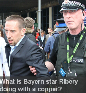 '뮌헨 스타 리베리, 경찰과 뭘하고 있는 거지?''리베리 맨체스터공항에서 경찰에 체포? 맨유 팬들의 바람에도 불구하고 이는 군중통제일 뿐' 등의 타이틀을 달았다. 경찰에 연행되는 듯한 교묘한 각도와 심각한 표정으로 나온 '뮌헨 에이스'의 사진을 통해, 올시즌 최단기간 분데스리가 우승 기록을 달성한 '거인' 바이에른 뮌헨과의 맞대결을 부담스러워하는 맨유의 입장을 슬쩍 빗댔다.