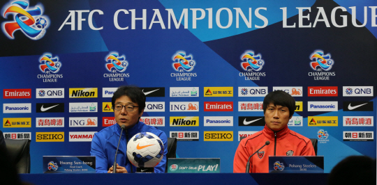 | ◇황선홍 포항 감독(왼쪽)과 주장 김태수가 1일(한국시각) 중국 지난의 올림픽 스포츠센터에서 열린 2014년 아시아챔피언스리그(ACL) 본선 조별리그 E조 4차전 공식 기자회견에서 질문에 답하고 있다. 사진제공=한국프로축구연맹 |