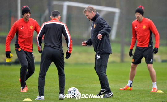 | 맨유 모예스 감독(오른쪽에서 두번째)이 긱스(왼쪽에서 두번째)와 함께 훈련하고 있다. ⓒAFPBBNews = News1 |