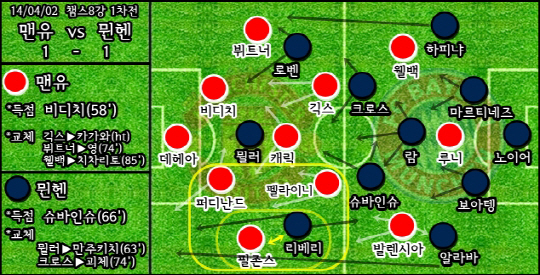전반전, 현실적인 선택을 내렸?다. 수비벽을 켜켜이 쌓아 상대 흐름을 틀어막으려 했다. 후반전, 현실적으로 선택을 해야 했다. 공격에 힘을 실어 2차전 원정의 부담을 줄여야 했다. 이것이 리그 7위 맨체스터 유나이티드(이하 맨유)가 27라운드 만에 리그 최단 기간 우승을 달성한 바이에른 뮌헨(이하 뮌헨)을 상대한 '생존법'이었다. 2일 새벽(한국시각) 영국 맨체스터 올드트래포드에서 열린 2013-14 UEFA 챔피언스리그 8강 1차전, 맨유와 뮌헨은 한 골씩 주고받으며 1-1 무승부를 이뤘다.