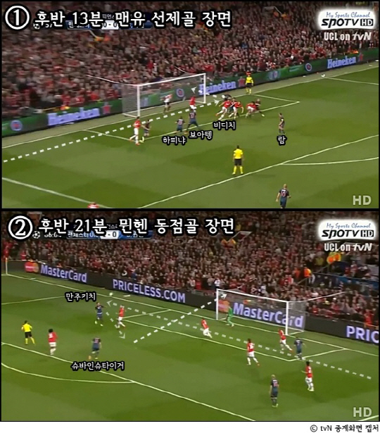 맨유가 공격적으로 올라왔다는 건 그만큼 뮌헨이 활용할 공간도 많아진다는 얘기. 중앙으로 좁혀온 뮌헨은 보다 다양한 연계플레이를 펼친다. 맨유 수비를 등 진 상태에서 패스를 연결해 동료의 슈팅각을 만들어냈다. 여기에 뮐러 대신 만주키치를 들여 보내 높이의 무게감도 늘렸다. 후반 21분, 왼쪽에 비해 잠잠했던 로벤-하피냐의 오른쪽 측면이 양질의 크로스를 제공한다. 만주키치의 머리를 거치던 볼 궤적에 맨유 수비의 시선은 쏠려있을 수밖에 없었고, 그들의 수비 범위는 이 과정을 정면에서 지켜보며 쇄도하던 슈바인슈타이거에게 미치지 못했다. 원정골을 내준 탓에 부담은 배가 됐다.