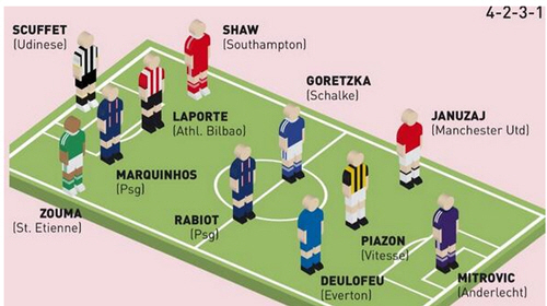 베스트 11로는 알렉산더 미트로비치(안더레흐트), 아드리앙 라비오트(PSG), 레온 고레츠카(샬케04), 아이메릭 라포르테(빌바오), 쿠르트 주마(생태티엔), 루크 쇼(사우스햄튼), 시메오네 스쿠페트(우디네세) 등이 선정됐고, 이밖에도 루카스 오캄포스(AS 모나코), 멤피스 데파이(에인트호벤), 리자르 마르코비치(벤피카), 세이두 케이타(발렌시아) 등 국내 축구팬들의 귀에도 익숙한 유망주들의 이름이 올라 있다.