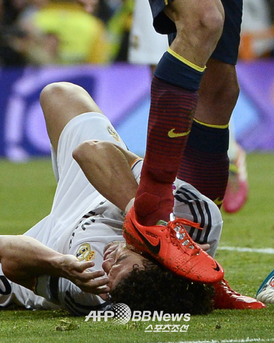 | 지난달 24일 바르셀로나전에서 페페가 넘어진 뒤 부스케츠의 발에 밟히는 장면. ⓒAFPBBNews = News1 |