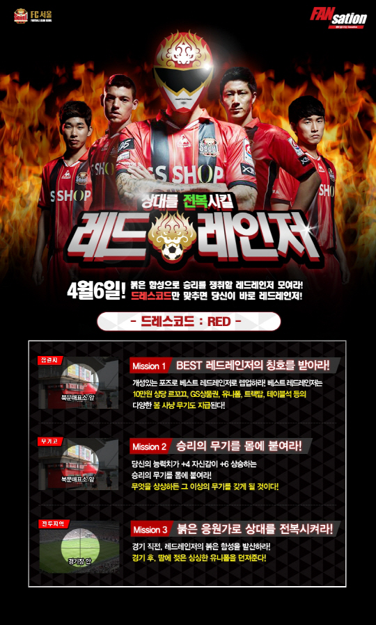 FC서울은 6일 오후 2시 서울월드컵경기장에서 전북과 2014년 현대오일뱅크 K-리그 6라운드를 치른다. '상대를 전복시킬 레드레인저'는 FC서울 상징색인 붉은색을 통해 팬들의 열정을 한데 모으는 이벤트다. 참가 조건은 단 하나, 드레스코드 'RED'이다. 붉은색 옷을 입고 오는 관람객들은 북측 매표소에 설치된 레드레인저 포토존에서 개성 넘치는 포즈로 사진을 찍을 수 있다. 그리고 참가자 중 베스트 레드레인저를 선정해 르꼬끄 상품권, GS칼텍스 상품권, FC서울 트랙탑, VIP테이블석 티켓 등 다양한 상품을 증정한다.