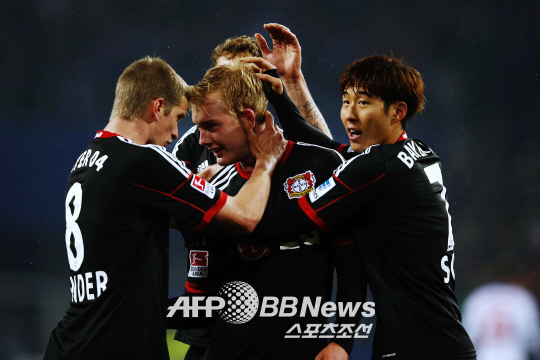 | ◇팀 동료가 골을 터트리자 함께 기뻐하는 손흥민(오른쪽). 함부르크(독일)=ⓒAFPBBNews = News1 |