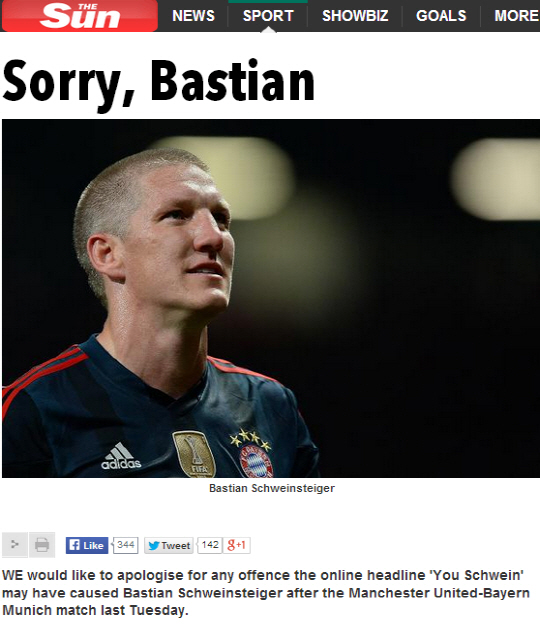 바스티안 슈바인스타이거를 두고 인신공격을 했던 영국 일간디 더선이 백기를 들었다. 더선은 5일(한국시각) '바스티안, 미안해(Sorry, Bastian)'라는 제목의 사과문을 온라인 홈페이지에 게재했다. 더선은 지난 2일 맨유와의 유럽챔피언스리그 8강 1차전에서 퇴장 당한 바스티안 슈바인스타이거를 두고 '돼지'라고 표현하면서 논란을 일으켰다. 뮌헨은 경기 후 성명을 통해 9일로 예정된 8강 2차전에 더선의 취재신청을 받지 않을 것이며, 사과문 게재를 요구하고 나섰다. 더선 측은 "(슈바인스타이거에 대한 차별적) 의도는 없었다"면서 "당시 문제를 인지하고 기사를 1시간 만에 온라인 상에서 삭제했다"고 주장했다.