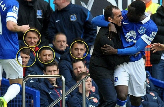 로멜로 루카쿠(에버튼)가 아스널전에서 팀의 두 번째 골을 성공시키고 로베르토 마르티네스 감독의 품에 안기는 장면을 보면서 아스널 선수 일부가 웃음을 띄고 있다.