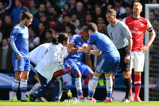 | 에토오가 지난달 22일 아스널전에서 햄스트링 부상으로 쓰러진 뒤 주위의 도움을 받고 있다. ⓒAFPBBNews = News1 |