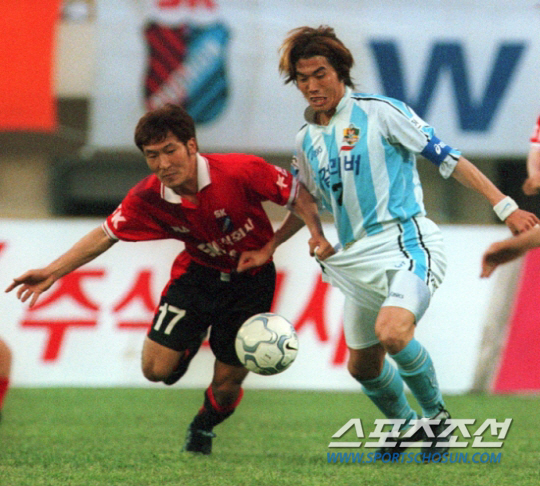 | ◇지난 2000년 5월 21일 목동종합운동장에서 열린 부천-울산 간의 K-리그 경기에서 윤정춘(왼쪽)과 김상훈이 볼을 다투고 있다. 당시 부천은 목동종합운동장을 홈구장으로 사용했다. 목동=김경민 기자 kyungmin@sportschosun.com |