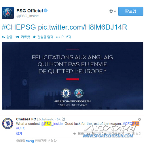 하지만 8강전의 최종 승부가 첼시의 승리로 돌아가자, PSG 공식 트위터는 "유럽(대회)에서 떠나고 싶지 않았던 영국인들(Anglais), 축하한다. 내년에 보자"라며 아쉬움 어린 인사를 전했다. 이에 첼시 공식 트위터도 "엄청난 대결이었다. 남은 시즌 잘 보내라"라며 훈훈하게 답했다.