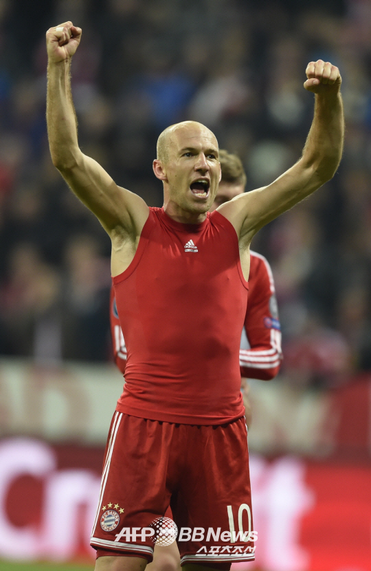 | ◇1골-1도움을 기록하며 바이에른 뮌헨의 4강행을 이끈 로번이 경기 후 환호하고 있다. 뮌헨(독일)=ⓒAFPBBNews = News1 |