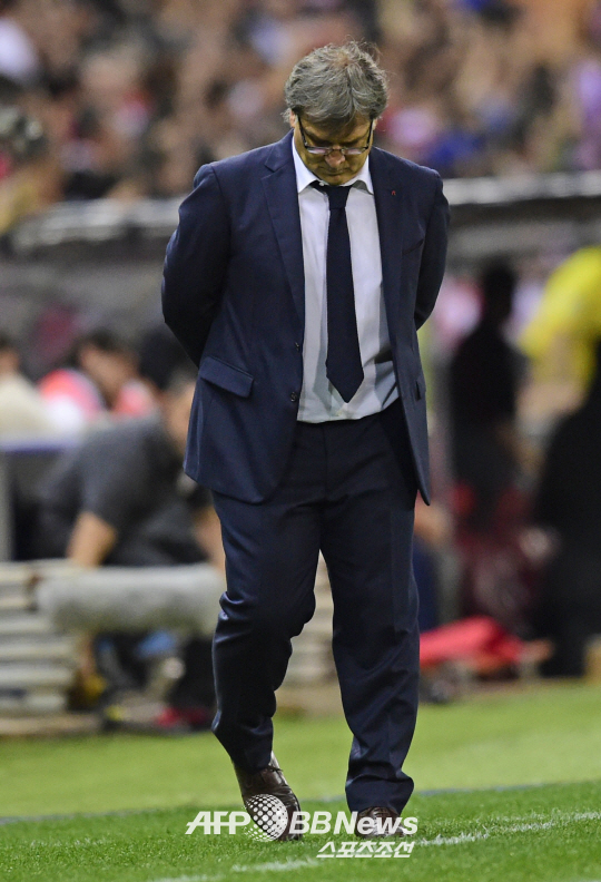 | ◇헤라르도 마르티노 바르셀로나 감독이 4강 진출이 좌절되자 고개를 떨구고 있다. 마드리드(스페인)=ⓒAFPBBNews = News1 |