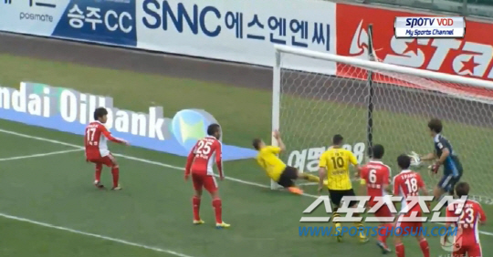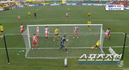 세트피스 상황에서 안용우의 왼발 크로스 직후 골문 바로 앞의 레안드리뉴가 몸을 날리며 밀어넣었다. 이 공은 골라인 안쪽에 서 있던 부산 골키퍼 이범영의 오른손에 걸렸고, 골라인을 넘지 않았다는 부심의 판단에 따라 곧바로 '노골'이 선언됐다. 레안드리뉴는 양팔을 활짝 펼친 채 세리머니까지 한 상황, 어리둥절한 표정을 지었다. 하프타임 '골라인' 판독을 둘러싸고, 현장에서 논란이 불거졌다. 경기감독관과 전남 관계자가 현장에서 중계화면을 확인했다. "카메라 각도에 따라 확언할 수는 없지만, 골키퍼의 자세와, 사각지대라서 부심이 보지 못했을 가능성이 있다"는 이야기가 오갔다. 이날 전남은 날카로운 공격력으로 부산을 압도했다. 전반 쏘아올린 6개의 슈팅은 모두 유효슈팅이었다. 후반 한지호와 센터백 이원영을 투입한 부산의 공세를 끝까지 이겨내며, 2대1로 승리했다.