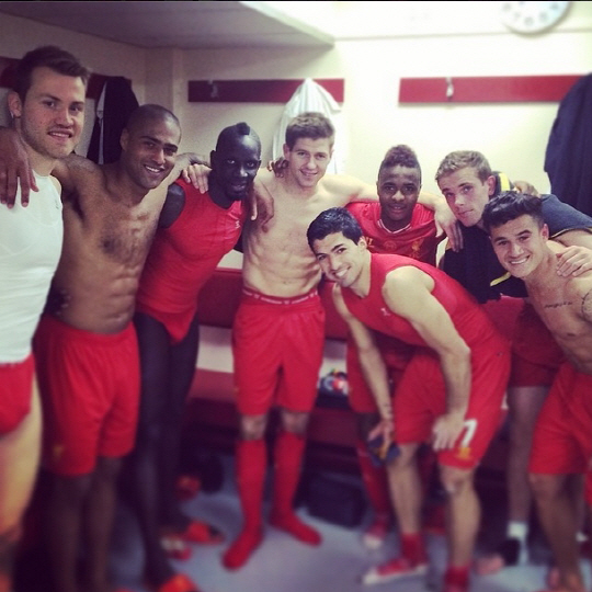 우승에 한발 더 다가선 리버풀 스타들이 안필드 라커룸에서 환희의 포즈를 취했다.