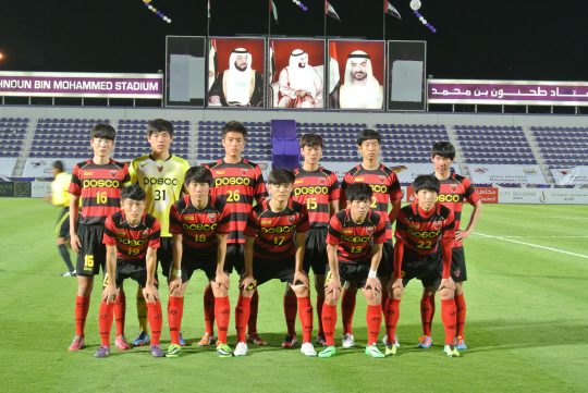 | ◇포항 18세 이하 유스팀(포항제철고) 선수단이 14일(한국시각) UAE 알아인에서 가진 맨시티와의 2014년 알아인국제청소년선수권 1차전에 앞서 포즈를 취하고 있다. 사진제공=포항 스틸러스 |
