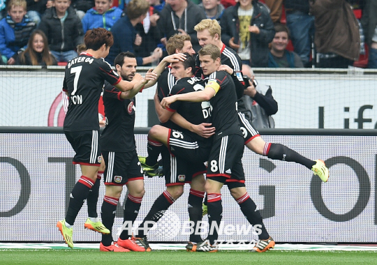 손흥민의 도움을 받은 브란트의 골이 터진 직후 레버쿠젠 선수들이 환호하고 있다. ⓒAFPBBNews = News1.