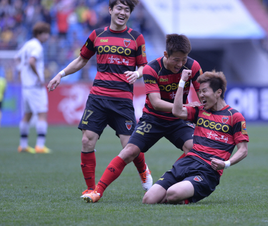 ◇포항 미드필더 김재성(오른쪽)이 12일 포항 스틸야드에서 펼쳐진 제주와의 2014년 K-리그 클래식 8라운드에서 전반 중반 선제골을 성공시킨 뒤 세리머니를 하고 있다. 사진제공=포항 스틸러스