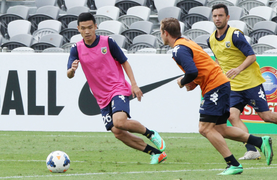센트럴코스트 매리너스(호주) 김승용(분홍색)이 16일 2014 아시아축구연맹(AFC) 챔피언스리그 F조 FC서울과의 경기를 앞두고 호주 센트럴코스트 스타디움(Central Coast Stadium)에서 몸을 풀고 있다.2014.04.16.호주 센트럴코스트=사진공동취재단.