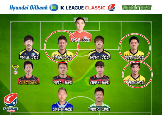 K-리그 클래식 8라운드 위클리 베스트11에 전남 드래곤즈 이종호, 현영민, 방대종 등 3명의 선수가 나란히 이름을 올렸다. 12개 구단 중 최다다.