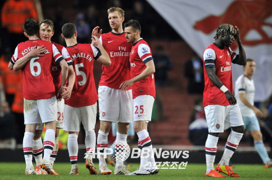 ◇아스널 선수들이 웨스트햄에 역전승을 거둔 후 서로를 격려하고 있다. 런던=ⓒAFPBBNews = News1