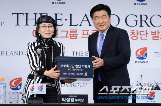 이랜드그룹의 프로축구단 창단발표식이 14일 신문로 축구회관에서 열렸다. 이랜드 그룹 박성경회장이 프로축구단 창단을 공식 발표하고 창단의향서를 한국프로축구연맹 (총재 권오갑)에게 제출하고 있다. 이랜드그룹 박성경 부회장은 "기업이 사회에 기여하는 방법의 하나로 팬들에게 재미와 즐거움을 주는 구단운영을 통해 한국축구발전에 이바지 하겠다" 고 말했다. 이랜드 그룹은 "NO1, 인기프로축구단" 이란 슬로건을 내걸고 2015년 K리그 클래식 승격을 목표로 하고있다. 축구회관=최문영 기자 deer@sportschosun.com /2014.04.14/