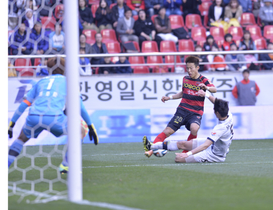 2014년 '메이드 인 포항' 대표주자는 미드필더 손준호다. 첫 해부터 주전 자리를 꿰찼다. 리그 8경기 중 4경기에 나서 1골-1도움을 올리며 알토란 같은 활약을 펼치고 있다. 지난해 리그와 FA컵 모두 정상에 오른 쟁쟁한 선배들의 틈바구니 속에서 기량을 발휘하기가 쉽지 않다. 하지만 패기 넘치는 플레이로 황선홍 포항 감독의 눈도장을 받았다. 본인도 지금의 흐름이 놀라운 눈치다. "포항에 입단하면서도 주전으로 나서기 힘들 것 같았다. 언젠가 기회를 올 거라 생각했는데 우연히 (황)지수형이 다쳐 기회를 잡았다." 상주전에서 프로 데뷔골을 넣은 순간에 대해서는 "패스가 오는 순간 슈팅을 해야겠다고 마음을 먹었다"며 "경기 후 선배들로부터 축하를 받았다"고 기분좋은 표정을 지었다.