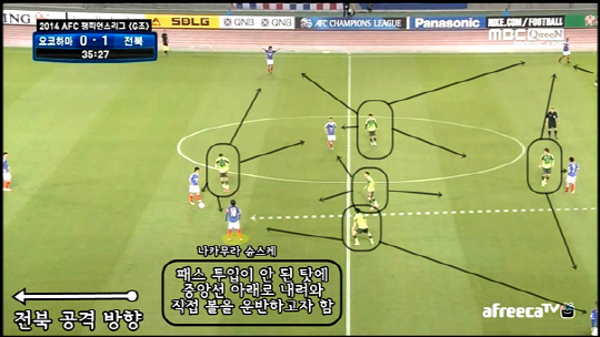 포지션별로 만들어낸 압박의 거미줄은 상대를 모조리 빨아들였다. 요코하마 수비진은 패스를 받는 퍼스트 터치를 수비 쪽 방향으로 할 수밖에 없었다. 앞으로 쳐놓기엔 전북 공격진과의 거리가 가까워 도전적인 플레이가 나와야 했기 때문. 자연히 백패스가 많이 나왔다. 상황이 이러하자 나카무라 슌스케까지 내려와 볼을 받으려 했다. 그럼에도 여의치 않았던 요코하마는 단번에 길게 연결하는 방법을 시도한다. 앞선 공격진이 롱볼을 키핑하는 동안 동료들이 쇄도해 공격 숫자를 늘리는 식이었다. 전북은 이마저도 허락하지 않았다. 볼 소유권을 닥치는 대로 훔쳤다.?