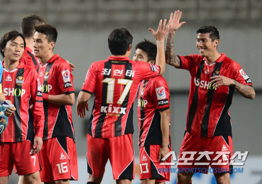 FC 서울과 제주 유나이티드의 2014 프로축구 경기가 26일 서울 상암월드컵경기장에서 열렸다. 서울이 제주를 2-0으로 꺾고 시즌 첫 승을 거둔 가운데 서울 차두리가 최현태와 하이파이브를 하고 있다. 상암=정재근기자 cjg@sportschosun.com/2014.03.26/
