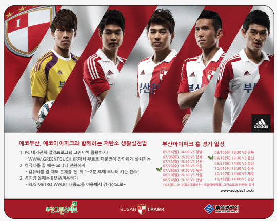 부산 아이파크는 19일 오후 2시 부산아시아드주경기장에서 펼쳐지는 K-리그 클래식 9라운드 성남FC전에서 친환경, 저탄소 '그린스포츠' 협약을 진행한다. '에코 부산, 에코 아이파크!'라는 슬로건하에 진행될 협약은 부산그린스타트네트워크와 부산광역시 환경녹지국과 함께한다. 부산은 이번 협약을 통해 축구장을 찾는 팬들과 함께 B(bus), M(metro), W(walk)를 이용한 축구장 찾기와 축구장 쓰레기 분리배출 운동을 함께 이어갈 계획이다.