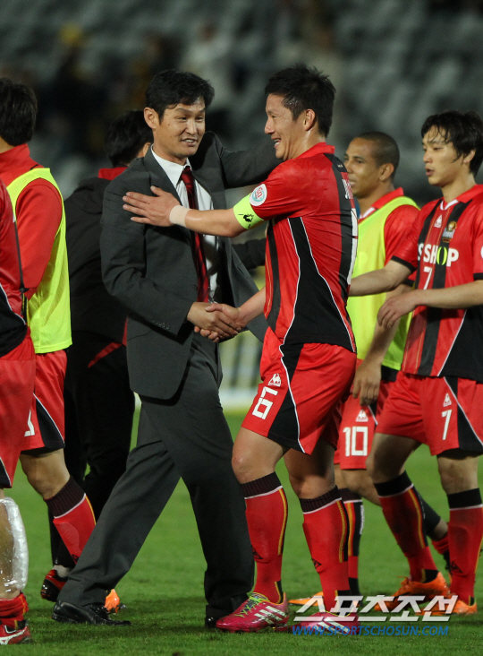 FC서울 김진규가 16일 2014 아시아축구연맹(AFC) 챔피언스리그 F조 센트럴코스트 매리너스(호주) 원정 경기가 진행된 센트럴코스트 스타디움(Central Coast Stadium)에서 결슬골을 넣은 후 최용수 감독과 악수를 하며 활짝 웃고 있다.2014.04.16.호주 센트럴코스트=사진공동취재단.