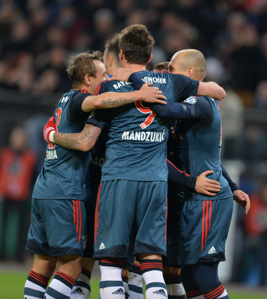 최근 분데스리가에서 2연패에 당하며 잠시 흔들리던 바이에른 뮌헨은 17일(한국시각) 독일 뮌헨 알리안츠 아레나에서 열린 카이저슬라우테른과의 2013~2014시즌 독일 DFB 포칼 준결승에서 5대1 대승을 거뒀다. 가벼운 부상으로 결장한 마누엘 노이어 골키퍼를 제외하고 정예 멤버들을 총출동시킨 바이에른 뮌헨은 일찌감치 승기를 잡았다. 전반 24분 아르옌 로벤의 코너킥을 바스티안 슈바인슈타이거가 헤딩골로 연결하며 앞서 나갔다. 기세가 오른 바이에른 뮌헨은 32분 로벤의 패스를 이어받은 토니 크로스가 강력한 오른발 땅볼슛으로 추가 골을 넣으며 전반을 2-0으로 앞서나갔다. 후반에도 바이에른 뮌헨의 골폭풍은 계속됐다. 후반 5분 로벤이 얻어낸 페널티 킥을 토마스 뮐러가 차분하게 성공시키며 사살상 승부에 쐐기를 박았다. 15분 카이저슬라우테른은 지몬 촐러의 헤딩골과 함께 뒤늦게 추격에 나섰으나 33분 마리오 만주키치, 종료 직전 마리오 괴체가 골을 추가하며 5대1 대승에 마침표를 찍었다.