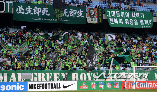 전북 현대와 광저우 에버그란데(중국)의 2014 AFC(아시아축구연맹) 챔피언스리그 G조 4차전이 2일 전주월드컵경기장에서 열렸다. 전북 서포터즈가 응원전을 펼치고 있다. 전주=허상욱 기자 wook@sportschosun.com/2014.04.02/