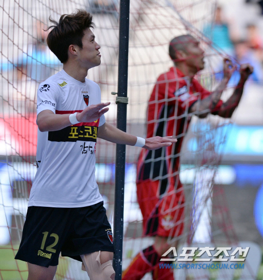 ◇김승대가 20일 서울월드컵경기장에서 열린 서울과의 2014년 K-리그 클래식 9라운드에서 후반 32분 결승골을 터뜨린 뒤 서포터스를 향해 세리머니를 자제하자는 손짓을 하고 있다. 상암=김경민 기자 kyungmin@sportschosun.com