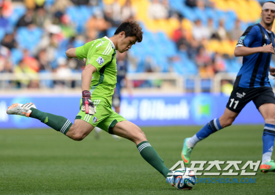 인천과 수원의 2014 K리그 클래식 8라운드 경기가 13일 인천축구전용경기장에서 열렸다. 수원 골키퍼 정성룡이 볼을 차고 있다. 인천은 개막 후 4무 3패를 거두며 첫 승이 간절하고 6위 수원은 시즌 초반 부진을 딛고 최근 3경기 2승 1무로 연속 무패행진을 달리고 있다. 인천=허상욱 기자 wook@sportschosun.com