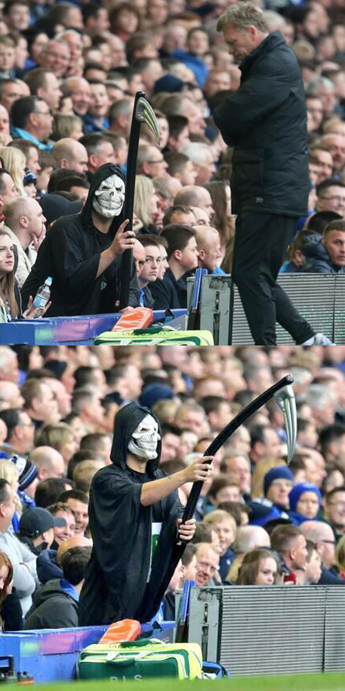 이 에버튼 팬은 해골 가면에 검은색 후드 달린 옷, 검은색 낫으로 영락없는 '그림 리퍼(죽음의 사신)' 코스프레를 하고 있다. 낫으로 모예스를 겨냥한 채, 가면 역시 모예스를 바라보며 이빨을 드러내고 비웃는 듯한 모습이다.