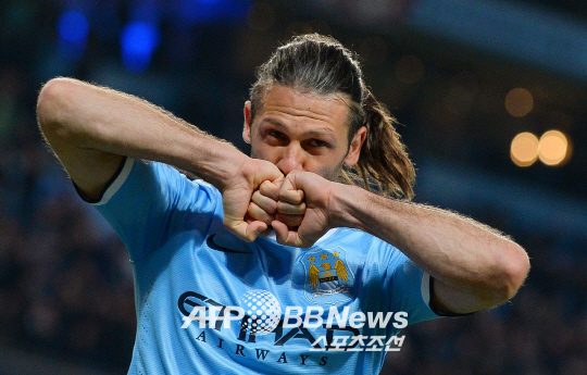| ◇맨시티의 수비수 데미첼리스가 쐐기골을 터트린 후 환호하고 있다. 맨체스터(영국)=ⓒAFPBBNews = News1 |