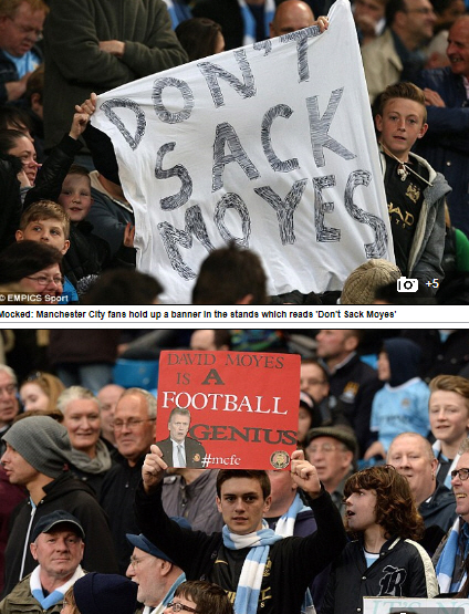 맨시티 팬들은 22일(한국시각) 맨체스터 에티하드 스타디움에서 벌어진 2013~2014시즌 EPL 35라운드 맨시티-웨스트브로미치전에서 다양한 플래카드를 선보였다. '모예스 감독을 경질하지 마라!', '모예스 감독은 축구 천재다.'