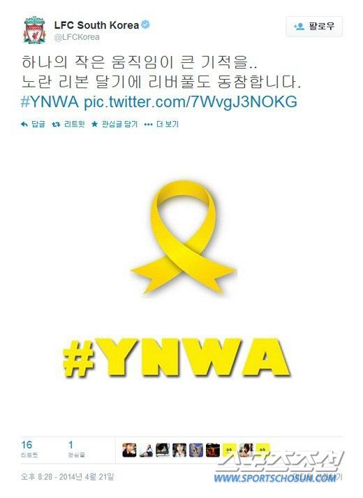 세월호 침몰 사고 실종자들의 무사귀환을 바라는 SNS캠페인 '노란리본 달기'가 한국 네티즌들의 큰 호응을 얻고 있는 가운데 영국 유명 축구클럽인 '리버풀FC(이하 리버풀)도 동참해 눈길을 끌었다.
