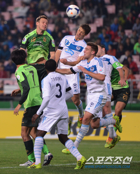 22일 오후 전주월드컵구장에서 2014 AFC 챔피언스리그 조별리그 6차전 전북 현대와 멜버른 빅토리의 경기가 열렸다. 전북 윌킨슨(왼쪽)이 멜버른 레이젤과 헤딩볼을 다투고 있다. 전주=김경민 기자 kyungmin@sportschosun.com / 2014.04.22.