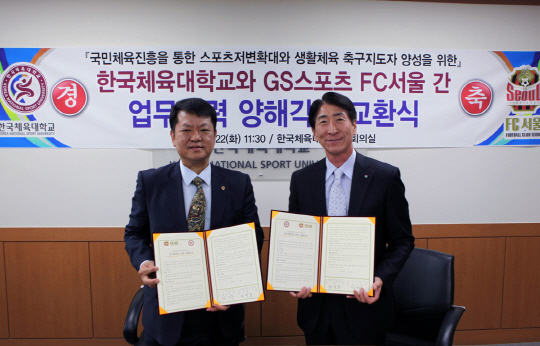 FC서울과 한체대는 22일 한체대 본관 소회의실에서 장기주 FC서울 대표이사와 한체대 정영희 총장 직무대리가 참석한 가운데 스포츠 인재 공유와 육성에 관한 업무협약 양해각서를 체결하고 상호 적극 협력할 것을 약속했다.