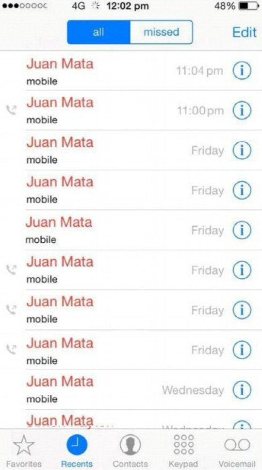 '축구천재' 모예스의 경질 소식에 극도로 좌절한 '라이벌' 맨시티, 리버풀 팬, 감독들의 사진 모음은 아예 하나의 장르로 자리잡았다. 비슷한 종류의 패러디물들이 다양한 버전으로 쏟아졌다. 모예스 경질 후 후안 마타의 이름으로 가득찬 무리뉴 감독의 휴대폰 통화목록 '패러디물' 역시 의미심장(?)하다. 모예스 감독은 지난 겨울 첼시에서 마타를 영입하며, 반전을 노렸지만 끝내 뜻을 이루지 못했다.