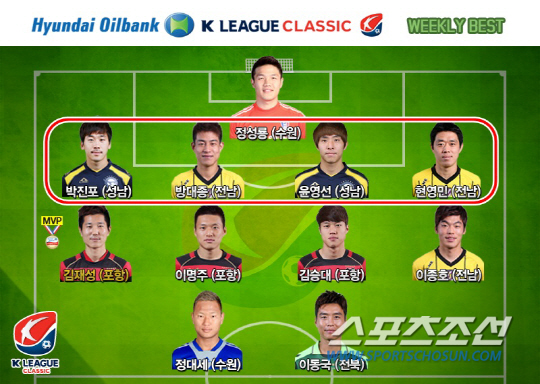 지난 8라운드 종료 직후 프로축구연맹이 발표한 베스트11 포백 라인에는 전남 2명, 성남 2명이 포진했다. 성남에선 '국대 에너자이저' 박진포와 중국리그에서도 눈독 들인 센터백 윤영선이 선정됐다. 전남에선 베테랑 왼쪽 풀백 현영민과 예비역 센터백 방대종이 선정됐다. 리그 최고의 포백라인, 전남 성남이 두자리씩 사이좋게 나눠가졌다.