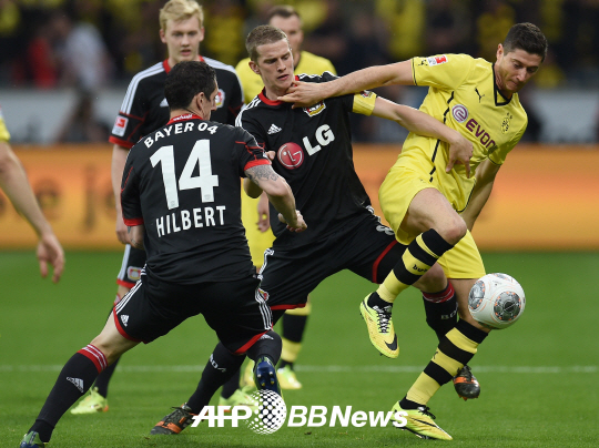 | 27일 벌어진 경기서 레버쿠젠과 도르트문트 선수들이 볼을 다투고 있다. ⓒAFPBBNews = News1 |